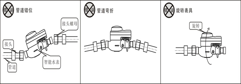 將表接頭套入接頭螺母后安裝到管道上,然后扭轉(zhuǎn)接頭螺母將水表安裝到管道上,保持水表讀數(shù)度盤水平向上,水表與管道連接時不應(yīng)受過大的折彎力,以免損壞水表接口斷裂。禁止出現(xiàn)如下圖所示的安裝方式: